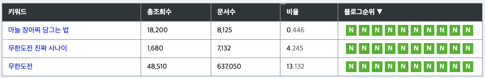 무한도전 키워드는 조회수도 많지만, 문서 수가 워낙 많기 때문에 블로그를 처음 시작하는 분들이라면 아무리 SEO에 맞춰 글을 쓰더라도